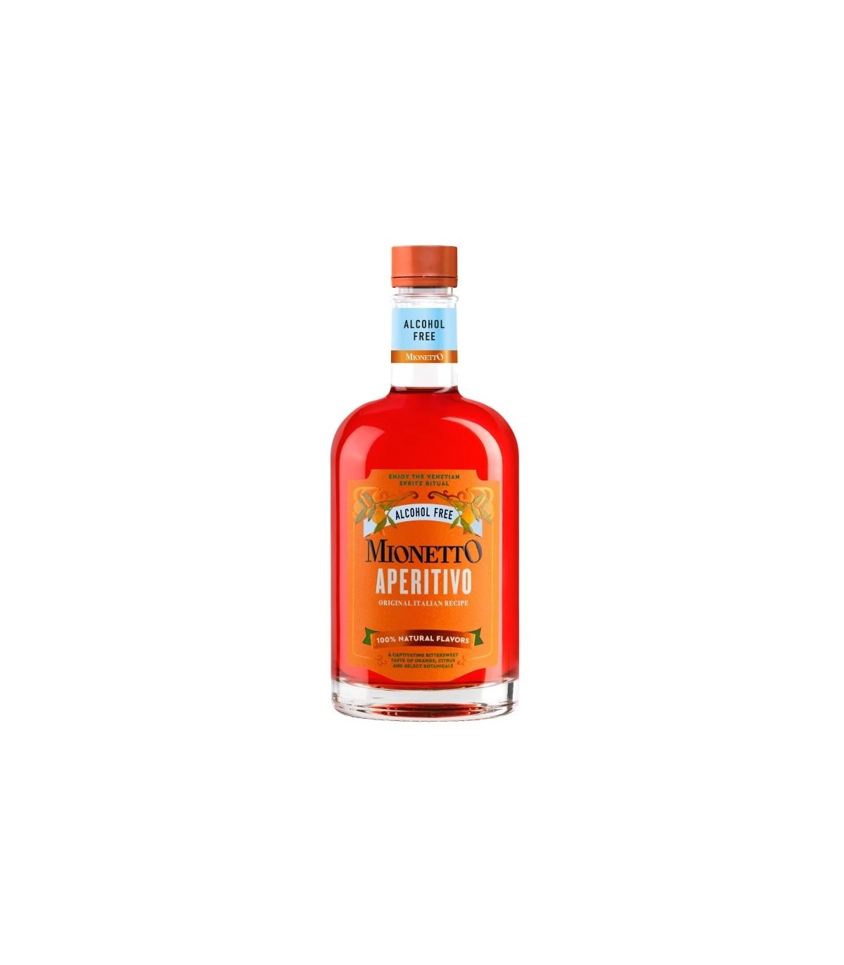 Mionetto Aperitivo Alcohol Free má originálnu taliansku receptúru bez alkoholu, vytvorenú so 100% prírodnými príchuťami. Má jedinečný charakter, kde sa spája sladkosť červeného pomaranča a sladkého drievka, so sviežou kyslosťou citrusov a horkosťou rastlinných látok pre najjemnejší prémiový zážitok zo Spritzu. Zažite dokonalý Venetian Spritz rituál v nealko štýle s novým pomarančovým Mionetto Aperitivo Alcohol Free, dokonale zladeným s ovocnou aromatikou Mionetto Alcohol Free.